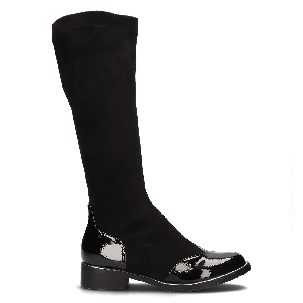 These black boots are perfect for everyday styling. The knee-high height and round toe make them look classic and universal. Thanks to the slip-on fastening, putting them on and taking them off is quick and comfortable. The plastic sole provides adequate grip and durability, and the 1 cm platform height adds subtle comfort.