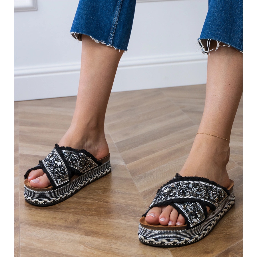 Discover the unusual style and comfort with black flip flops with stripes, which are the perfect combination of elegance and everyday slack. The X5-376 is a classic that will be perfect in the summer, both on the beach and during city walks. Their minimalist black color makes them fit into any styling, and at the same time add a bit of shine thanks to subtle zircons placed on the stripes.