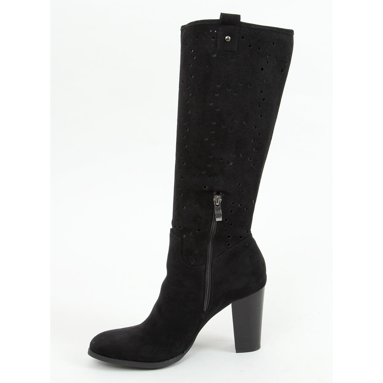 Openwork high-heeled boots black RT89956 Black are an ideal proposition for women who value both style and comfort. Made of high-quality ecological suede, these women's boots impress with their subtle openwork pattern, which adds a unique character to them. The stable 9 cm high post provides a perfect balance between elegance and comfort, which makes them a great choice for everyday wear.