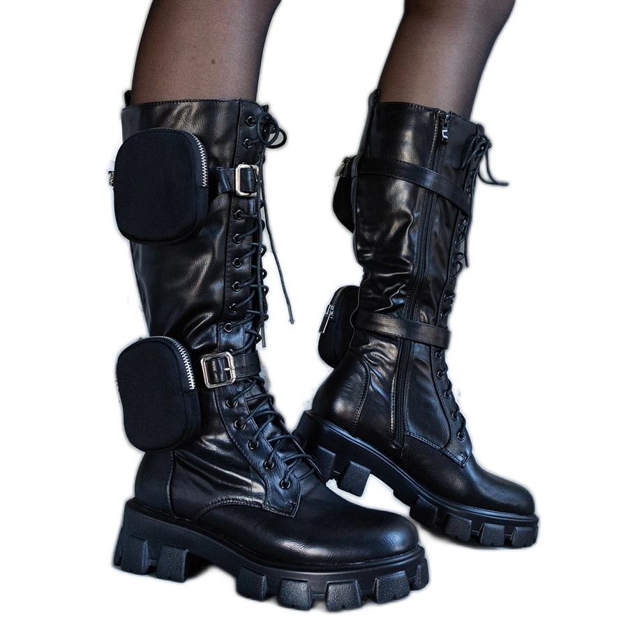 Elegant black peat boots combine a fashionable, massive look with practical solutions. Made of high quality ecological leather, with a thick, retreaded sole and round toe. A characteristic element is a decorative belt with a buckle and a small -slip sachet - ideal for keys or small items. Boots tied in front on the laces, until the side is fastened with a zipper for easy putting on. The insulated interior provides comfort on cooler days.