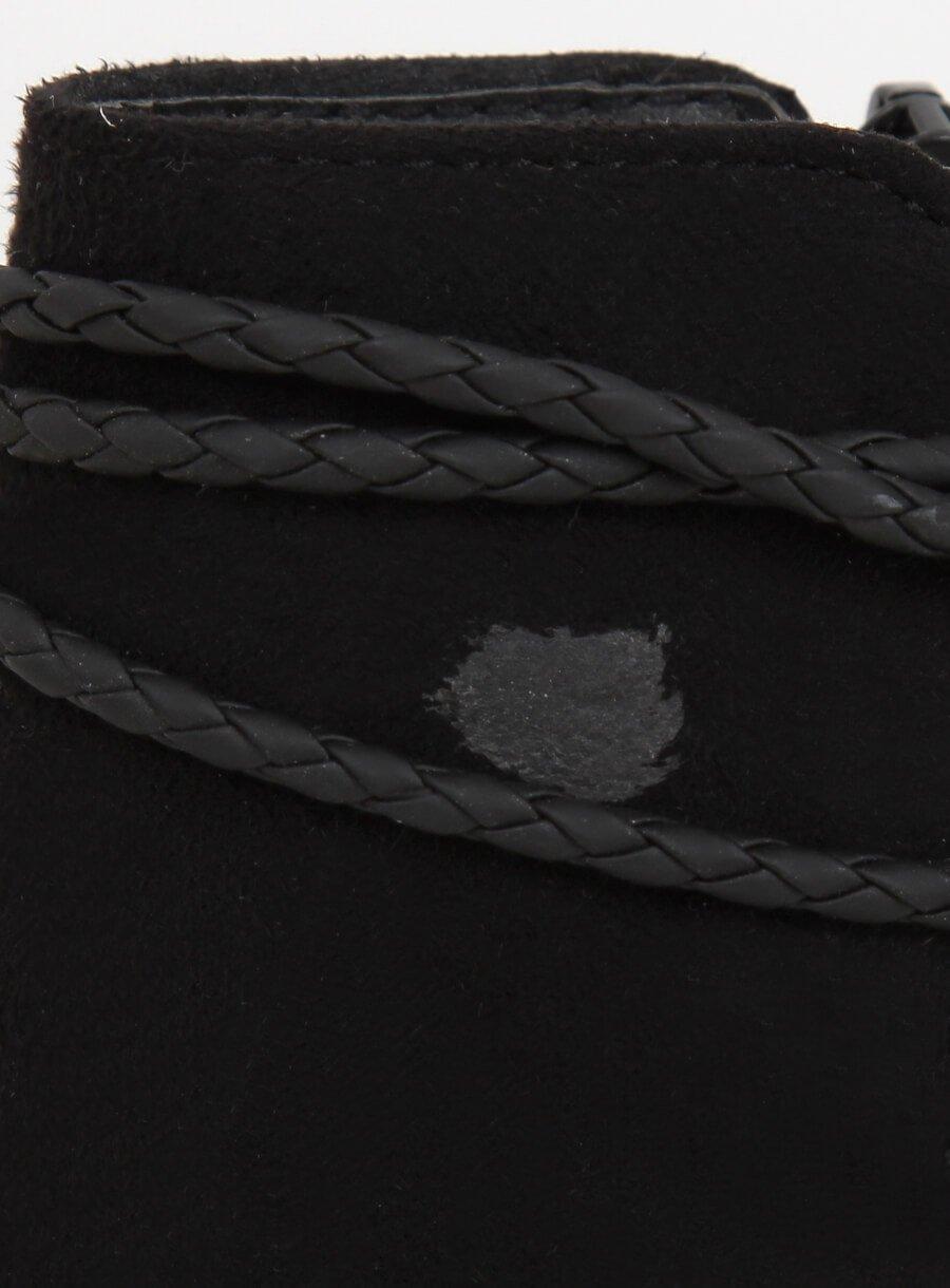 Stylish black women's boots on a stable post, ideal for everyday and semi -formal stylizations. The ecological suede upper is decorated with fringed straps, which effectively wrap the cube. The interior is lined with soft fur, which ensures comfort of wearing. Puting up a practical zipper placed on the side.