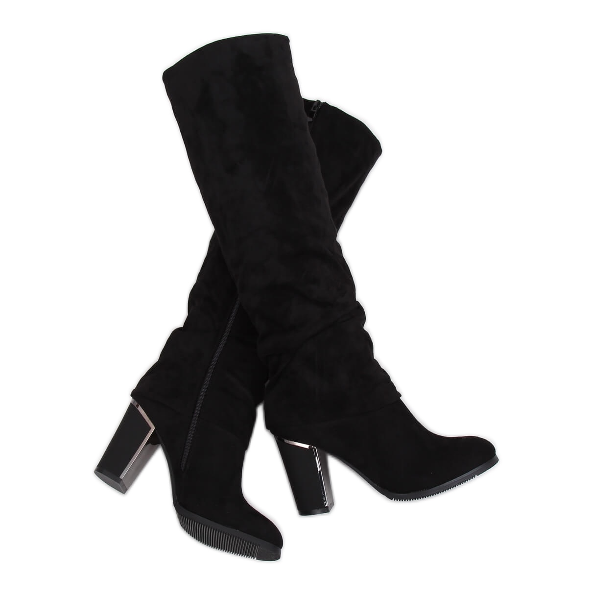 Black 1103-GG Black high-heeled boots are the perfect choice for women who value fashionable and elegant footwear. This model stands out for its uniqueness, thanks to its fashionably ruffled upper that attracts attention. The stable 9 cm heel in a matte finish perfectly combines with the suede material, adding charm to the silhouette and optically lengthening it.