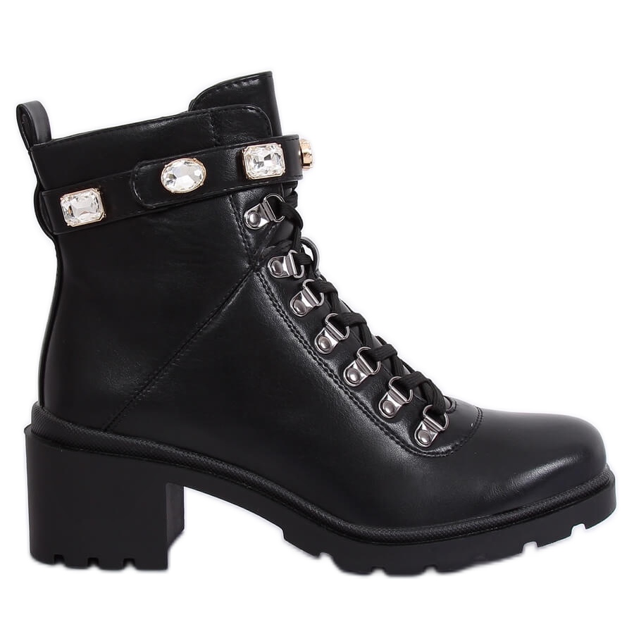 Discover the DA25 Black lace-up heeled ankle boots – a great choice for women who value style and comfort! These elegant full-grain ankle boots are made of shiny eco-leather, which gives them an extraordinary character. Their distinctive design is complemented by a decorative strap on the top of the upper, studded with shiny stones – the perfect detail that will make any styling shine.