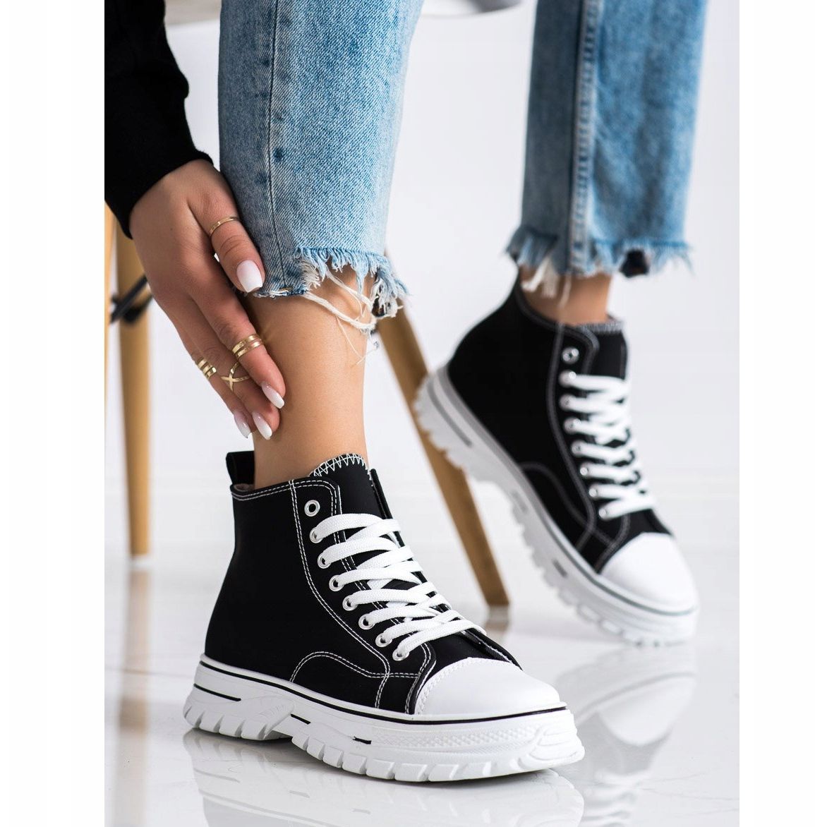 Discover the comfort and style offered by the black SHELOVET high-top sneakers, perfect for any occasion. These fashionable women's shoes impress with their minimalist design, which perfectly fits the sporty and casual character. Made of high-quality imitation leather, they provide not only aesthetics, but also durability, so they will accompany you for a long time.