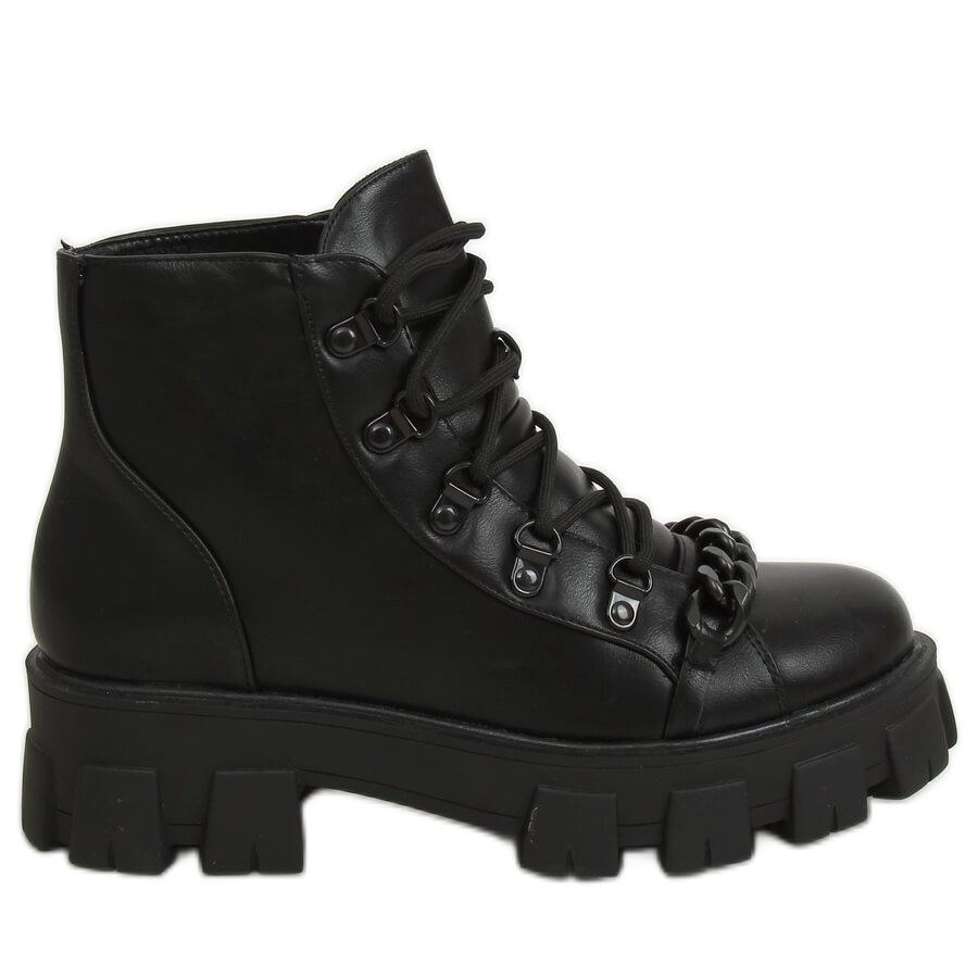 We present the lace-up ankle boots with a high sole NC1106 Black, which are a perfect combination of fashionable design and comfort. These elegant ankle boots, in timeless black, will certainly attract the attention of many women. They owe their characteristic silhouette to the high sole with a height of 5 cm and an effective chain placed on the front, which adds to their expressiveness and unique style.