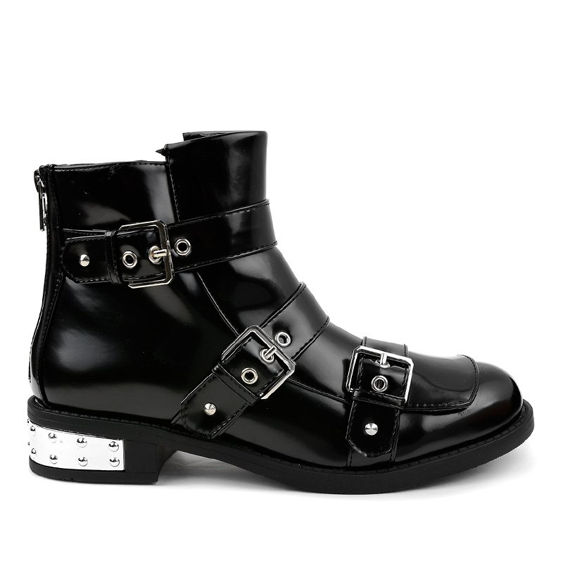 Made of shiny material in classic black, the A-388 ankle boots attract attention with decorative buckles and rhinestones that give them a modern character. The upper of the shoes is insulated, which ensures warmth and comfort even on the coldest days. Additionally, the ankle boots have a zipper on the side, which makes it easier to put on and take off the shoes.