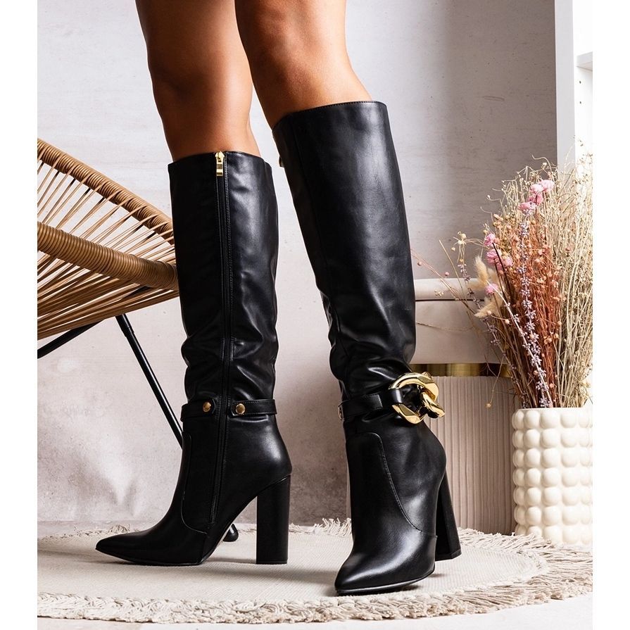 Discover black insulated Macari boots - a real hit of this season among cowboy models. These elegant and extremely feminine shoes are a combination of high quality ecological leather and fashionable design. Their characteristic pad in the spitz and matched upper decorated with a chain optically slim their legs, which makes every woman feel special in them.