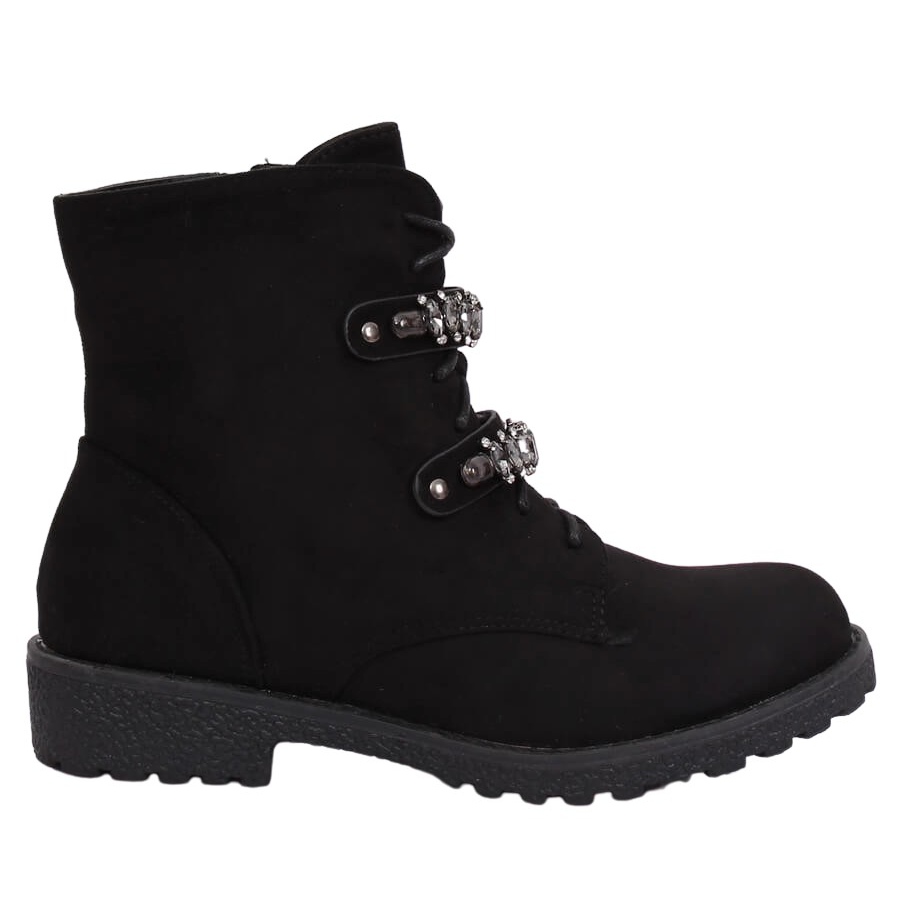 We present the unique black lace-up ankle boots H8-118 Black, which will become an inseparable element of your everyday wardrobe. Made of high-quality ecological suede, these stylish shoes combine elegance with functionality. The ankle boots stand out with shiny stones on the front, which attract attention and add character to any styling.