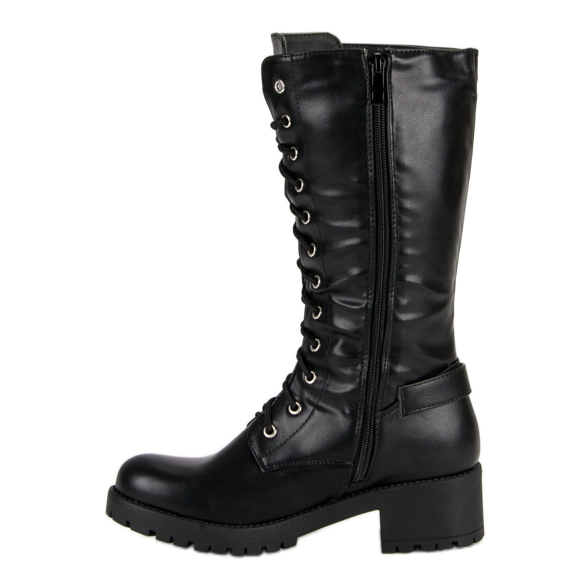 Black riding boots have a practical zipper and lace fastening, which allows for a perfect fit to any calf. Additional decorative straps with silver buckles give them a distinctive, bold look, perfect for women who want to add a little edge to their styling.