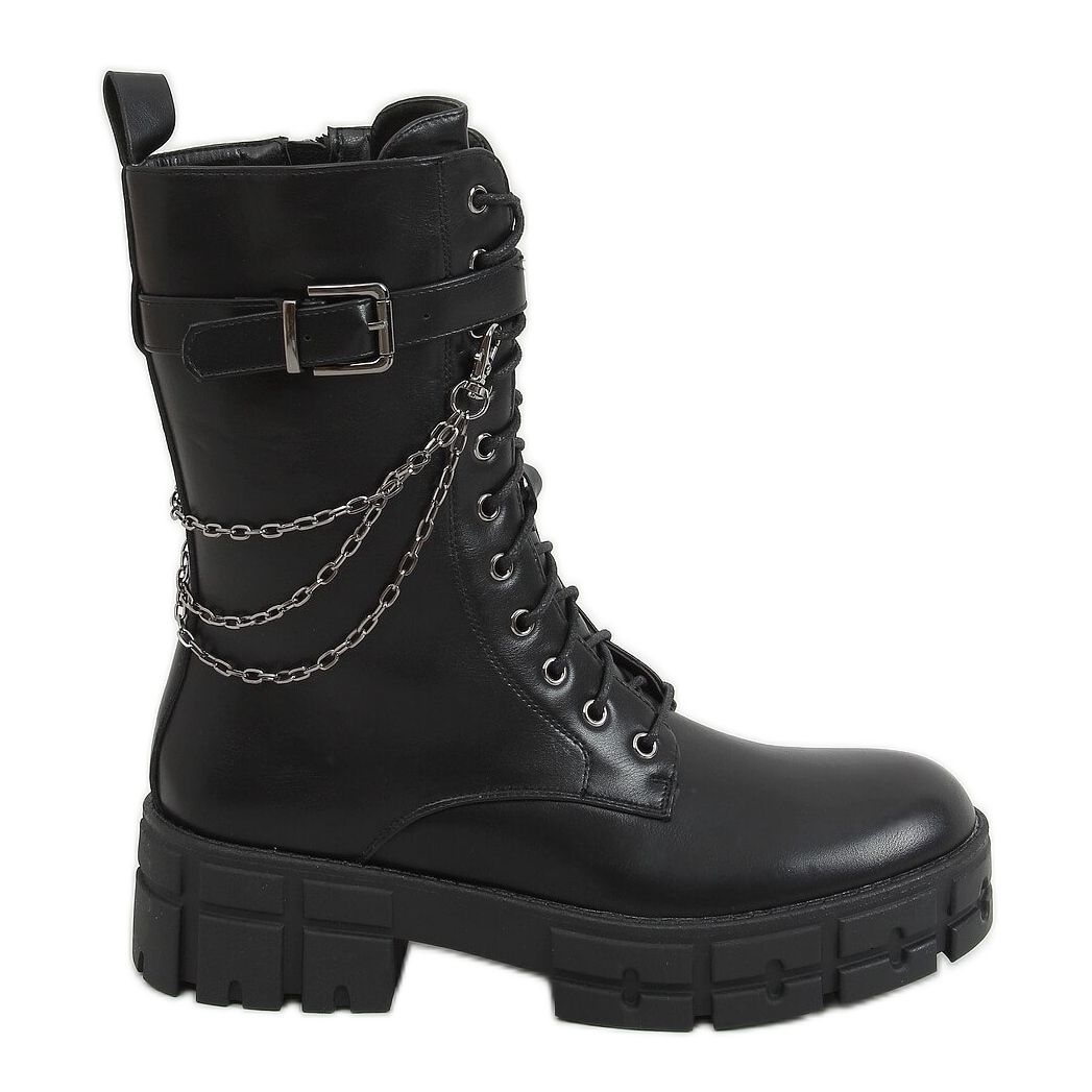 Elegant and stylish black lace-up work boots DA77P Black are the perfect choice for modern women who value comfort and a fashionable look. Made of high-quality eco-leather, these smooth ankle boots combine rock style with everyday functionality. With a wide 5 cm heel and a high sole (3 cm), they provide stability and comfort, regardless of the occasion.