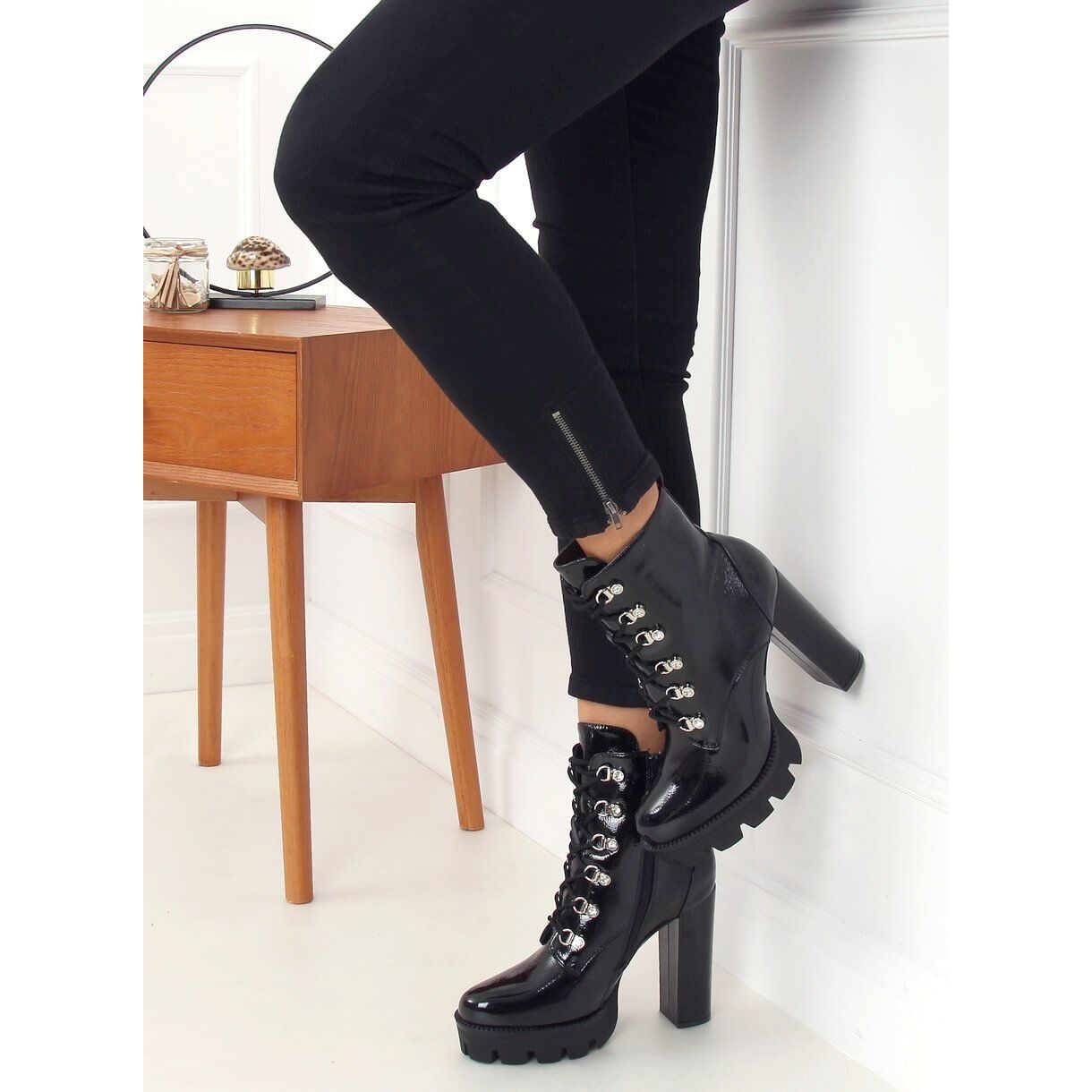 We present the unique 0-369 Black platform ankle boots, which will become an inseparable element of your wardrobe. These women's lace-up ankle boots in an elegant, patent black color will attract attention and add to your unique style.