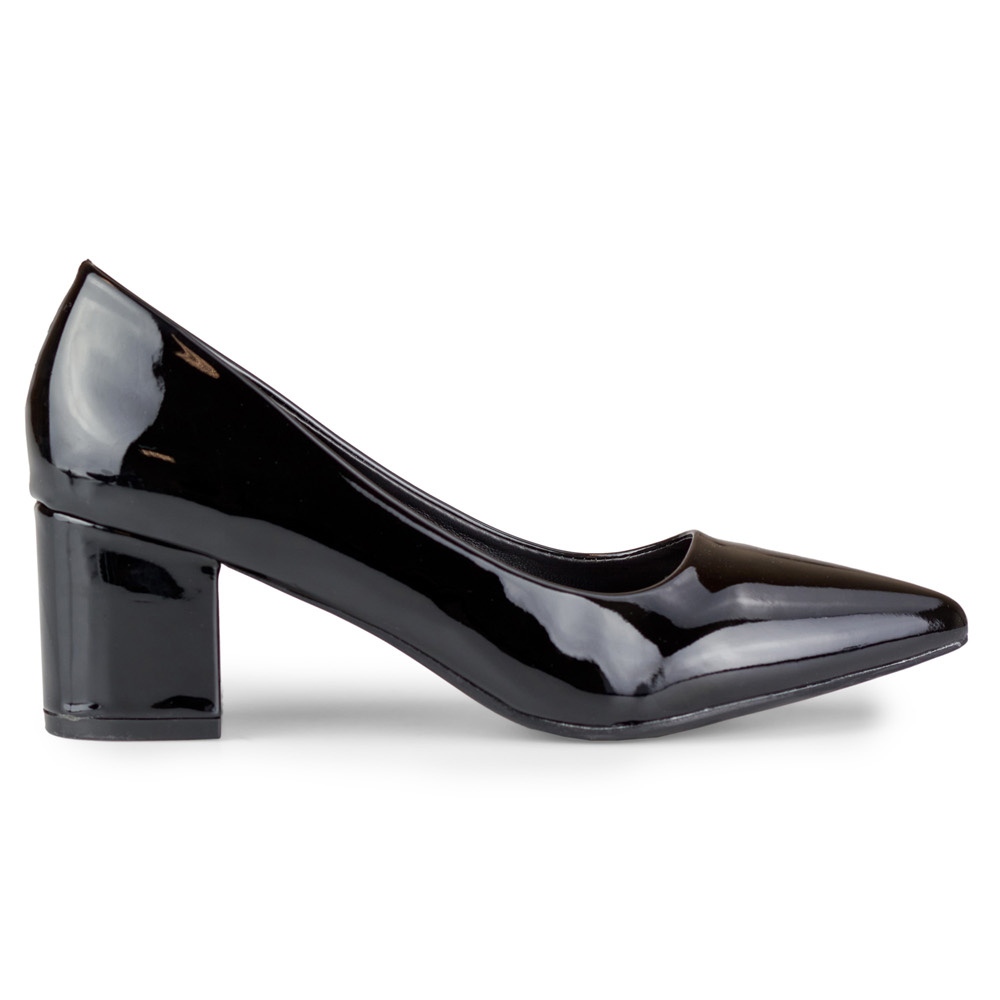 Black varnished pumps on a low post - elegance and convenience on a daily basis and for special occasions. Made of high quality ecological leather with a varnished finish, they look very stylish and easily adapt to many styles - from office to evening.