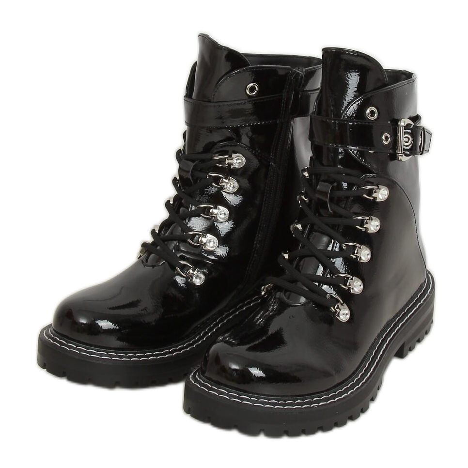 Discover the 8120-PA Black patent leather women's combat boots - the perfect choice for fashion lovers who want to stand out from the crowd! These lace-up boots are a combination of elegance and extravagance, and their shiny stones on the loops add a unique character. The patent finish makes them not only attractive but also practical, perfect for everyday outings.
