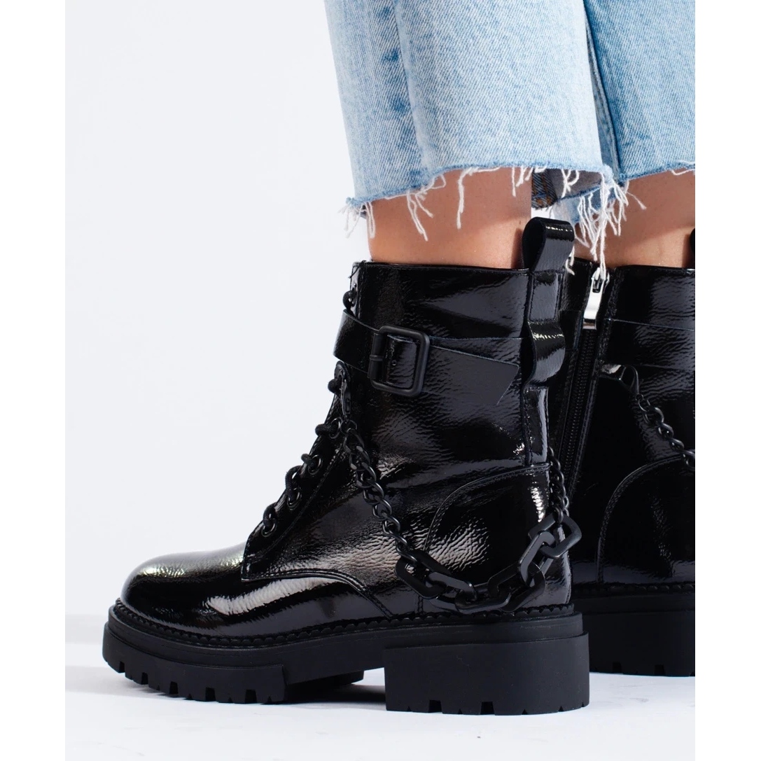 Black varnished workers with Shelovet chain - style, comfort and rock character in one.