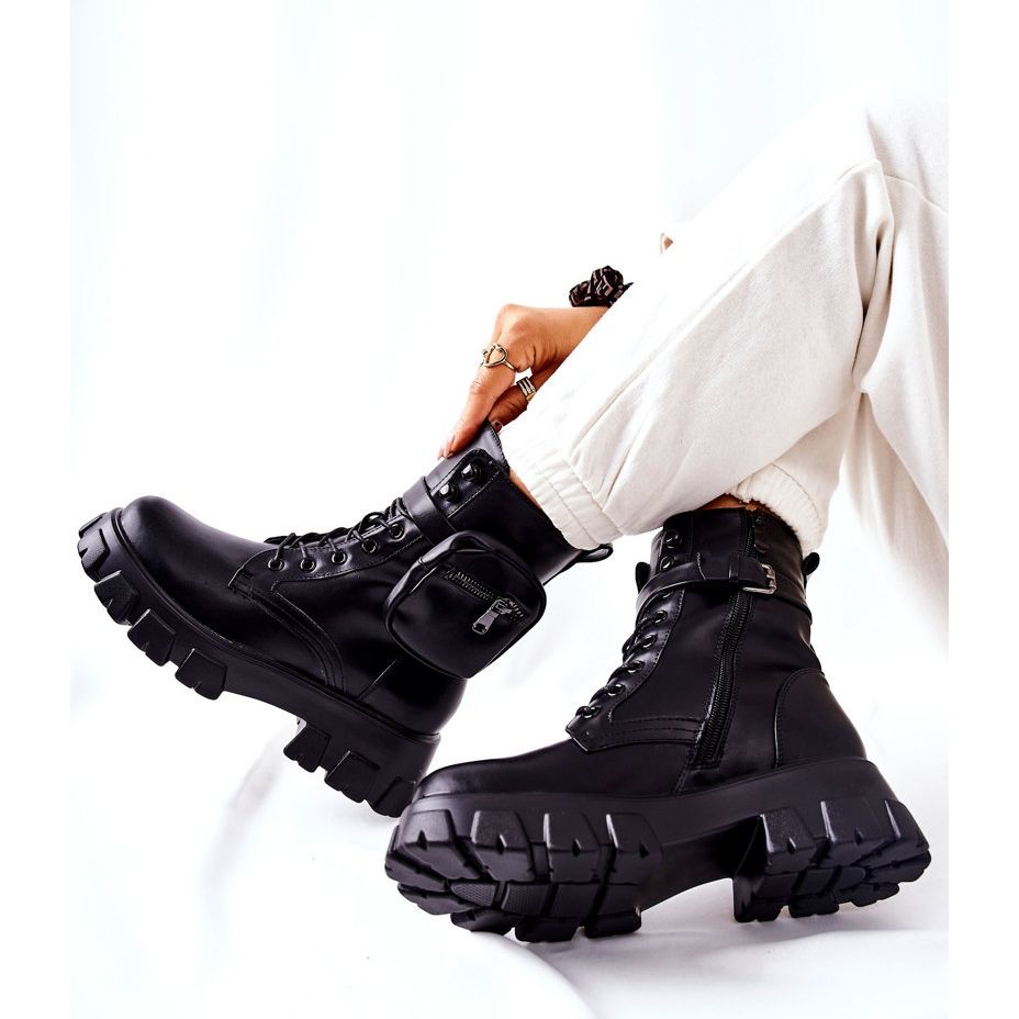 We present fashionable PG1 worker boots, which will be a perfect complement to any styling. Made of high-quality eco-leather, in an elegant black color, they combine modern design and functionality. A characteristic element of these boots is a side pocket fastened with a zipper, which is attached to the upper with a detachable strap on a buckle. Thanks to this, you can adapt them to your style and needs.