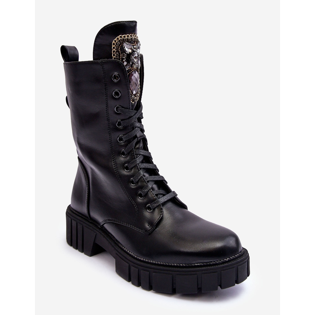 The boots have an ankle upper with a functional and stylish element in the form of a jewelry decoration on the tongue. It adds an elegant character to the footwear, making it stand out from the classic models. Moreover, to increase the convenience of use, they are equipped with practical lacing at the front and an additional zipper fastening for easy putting on.