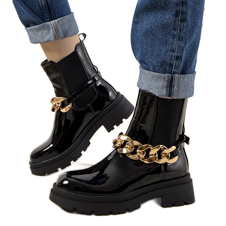 Discover our new proposal for autumn and winter – black patent ankle boots with Tapia chain. These stunning ankle boots combine elegance with modern design. Made of high-quality patent eco-leather, with the addition of a decorated gold chain, they attract attention and are a perfect complement to any outfit.