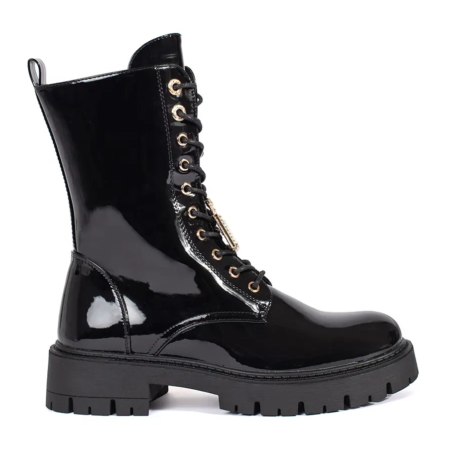 Details: Seastar Black patent lace-up worker ankle boots on the platform with pins