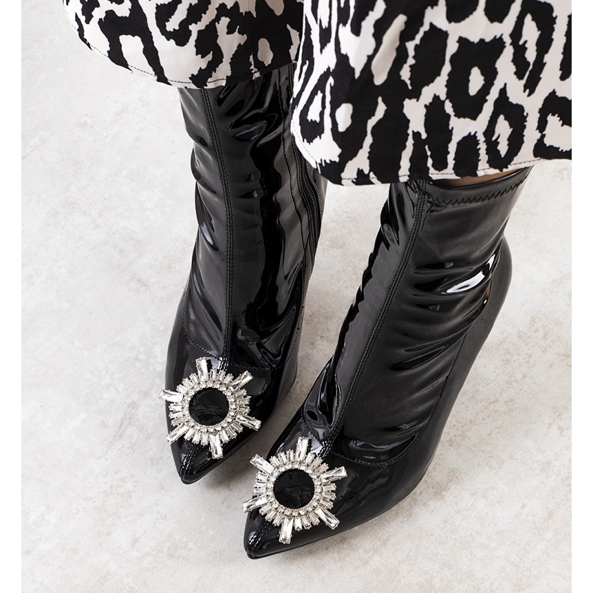 Phenomenal boots that will immediately add your stylization to style and sex appeal. The varnished upper made of high -quality ecological leather beautifully reflects light, and a slim nose in a spitz and 10.5 cm high pin lengthen the legs. Gentle zircon decoration adds elegance and subtle glow - perfect for evening outings and elegant occasions.