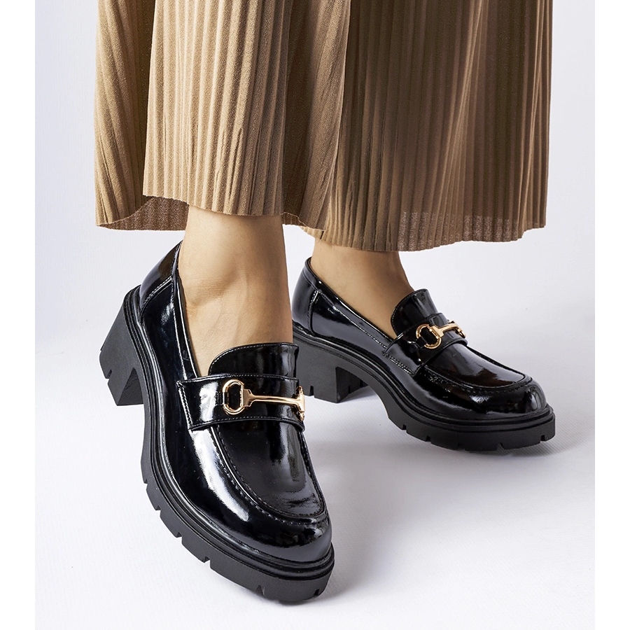 The classic and modern Fabrizio loafers are a proposal for women who value elegance and comfort. Varnished finish and a golden chain on the front give them a sophisticated character, thanks to which you can easily adapt them to both office stylizations and more casual or evening sets. The low, 6 cm heel ensures stability and comfort throughout the day, and the sliding structure and the round toe guarantee freedom of movement.