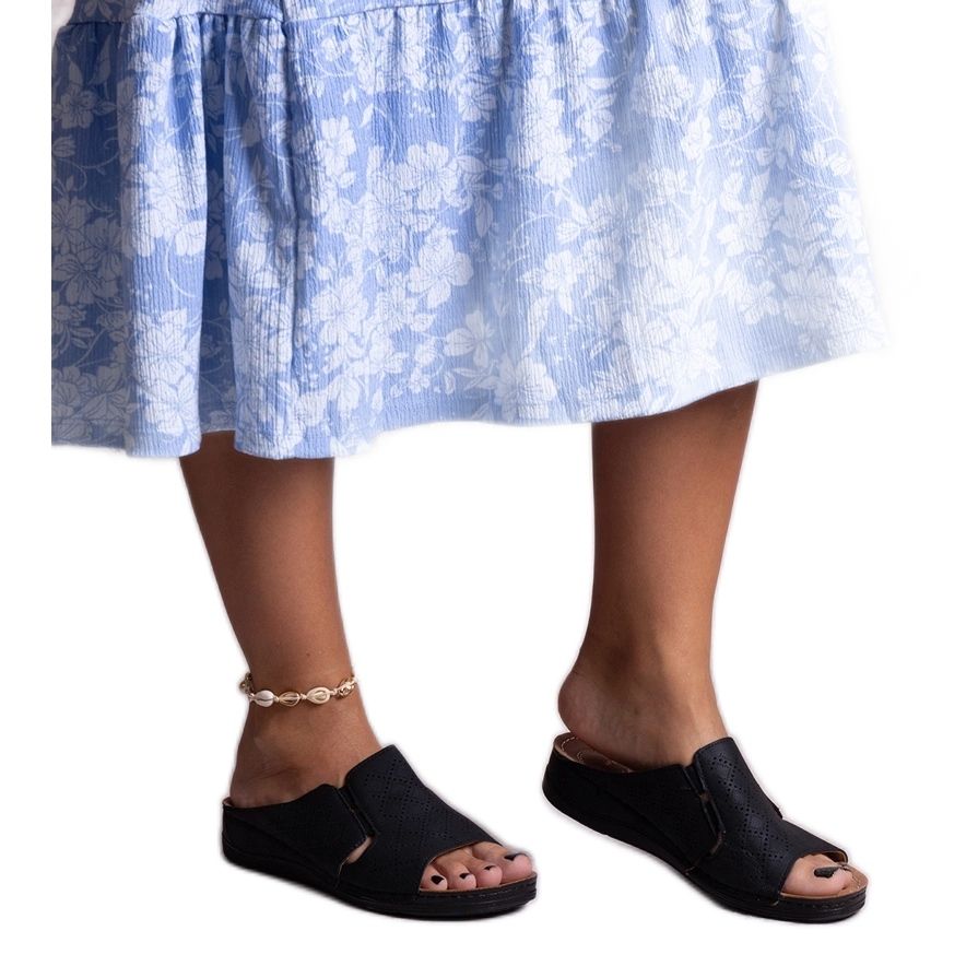 Marouna's black flip flops are characterized by a practical, sliding clasp, which makes it easier to put on and take off. Thanks to the 4 cm high platform, they add subtle several centimeters tall, while guaranteeing stability when walking. Their minimalist appearance without designs means that they match many summer stylizations, from casual to more elegant.