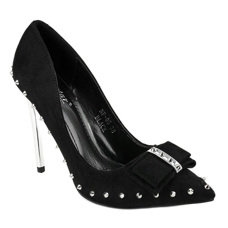 Black NF-05 high heel pumps are the perfect choice for women who value elegance and style. Their minimalist design is enriched with spectacular metallic studs and a bow at the front, which gives them a unique character. These shoes attract attention not only thanks to their original details, but also thanks to the high, 11-centimeter heel, which optically lengthens the legs and adds self-confidence.