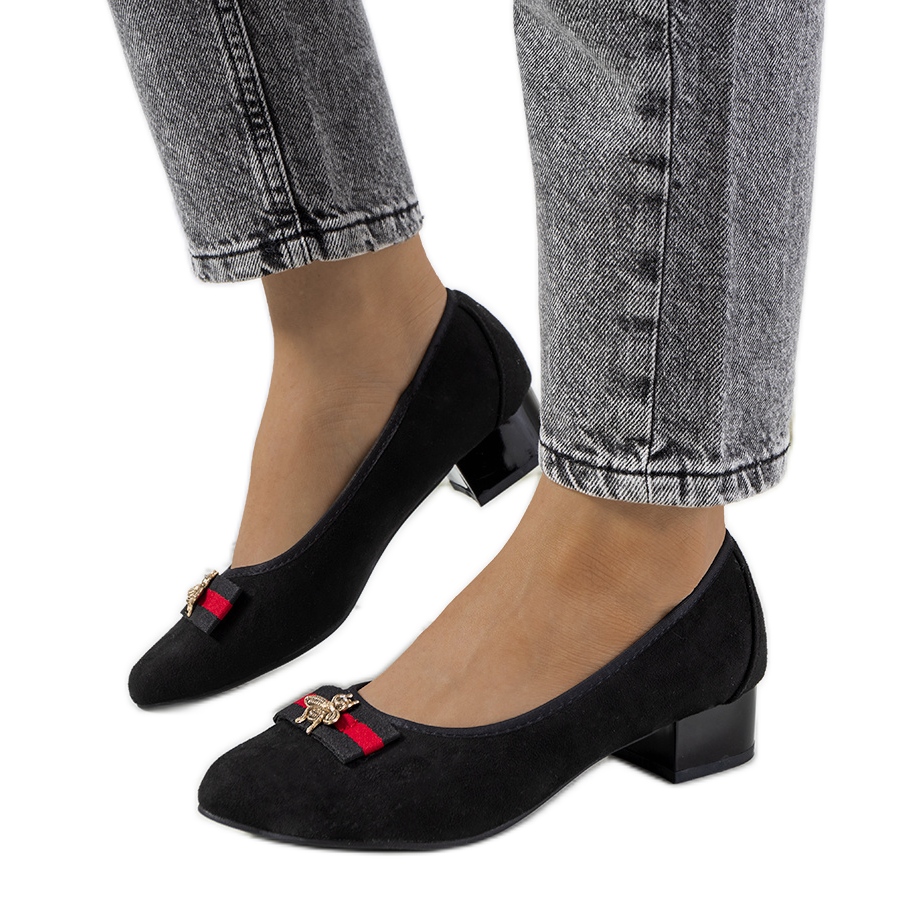 Chic Vijver pumps are a proposal for lovers of classics with an interesting detail. A smooth, suede ecological leather upper in deep black creates an elegant base, which is broken by a black and red ribbon with a spectacular fly-a detail that attracts eyesight, but not to send a timeless cut.
