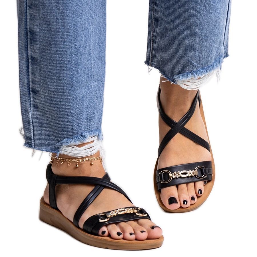 Black sandals with the Golden Pamphila buckle are a sophisticated choice for summer days, combining elegance with comfort. Made of high quality ecological leather, they provide not only a fashionable look, but also comfort when wearing. Their modern design seduces a golden decoration, which gives the whole a unique character.