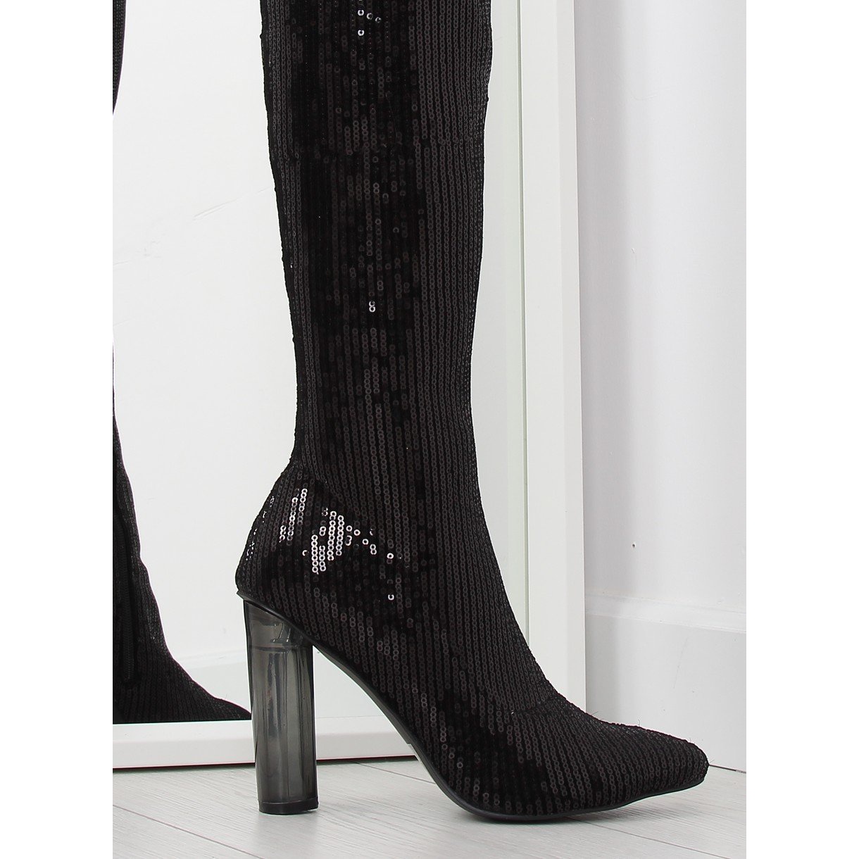 Discover the stunning AE55P black sequin over the knee boots that will add sparkle to any of your styles! These unique women's boots feature an original 10 cm heel, making them perfect for special occasions such as New Year's Eve madness or elegant parties.