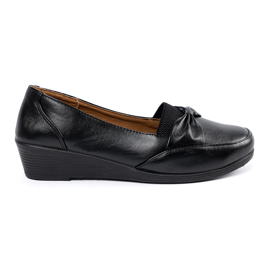 The characteristic round toe and built -in heel ensure comfort, and the height of the wedge of 5 cm subtly raises the figure, without giving up convenience. An additional advantage is the charming bow, which gives them a unique charm and makes them stand out from other models.