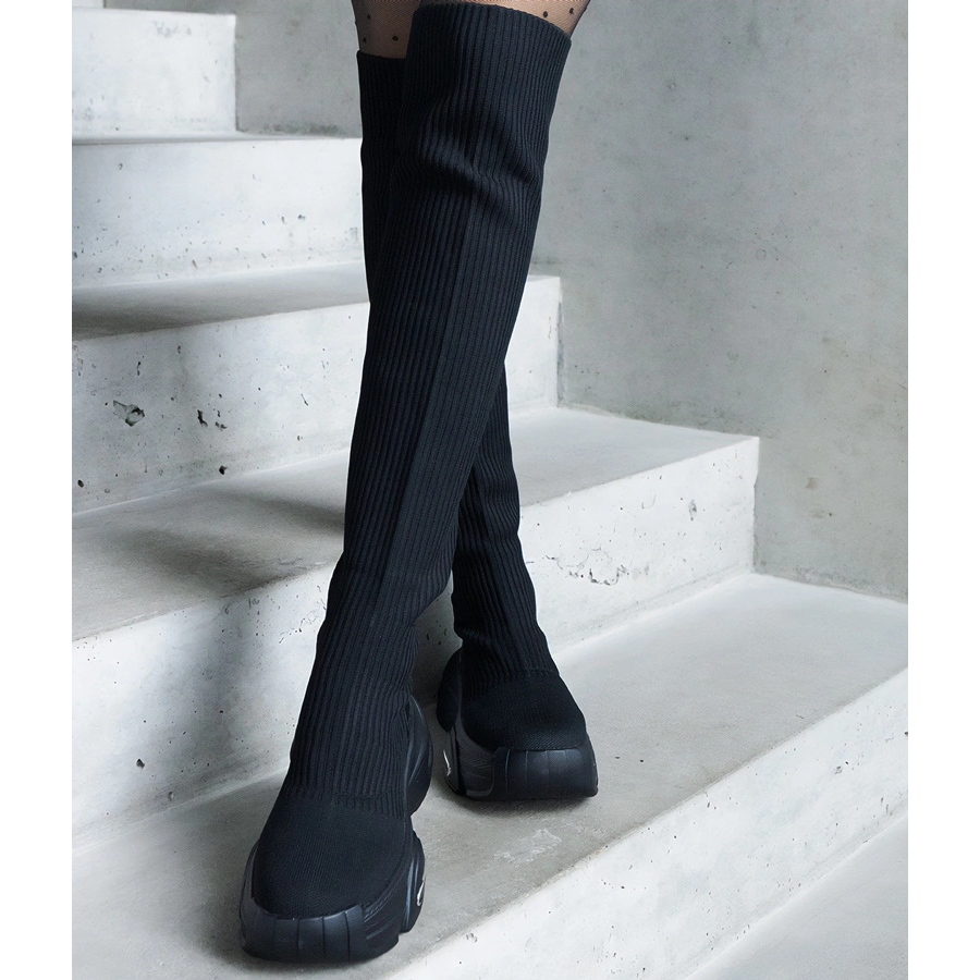We present black slipped boots with an elastic upper from another brand that delight with their modern design and comfort of wearing. These elegant musketeers, with a knee height (63 cm), perfectly emphasize the figure, and their classic black color makes them fit many styles - from everyday, through office, to evening outings.