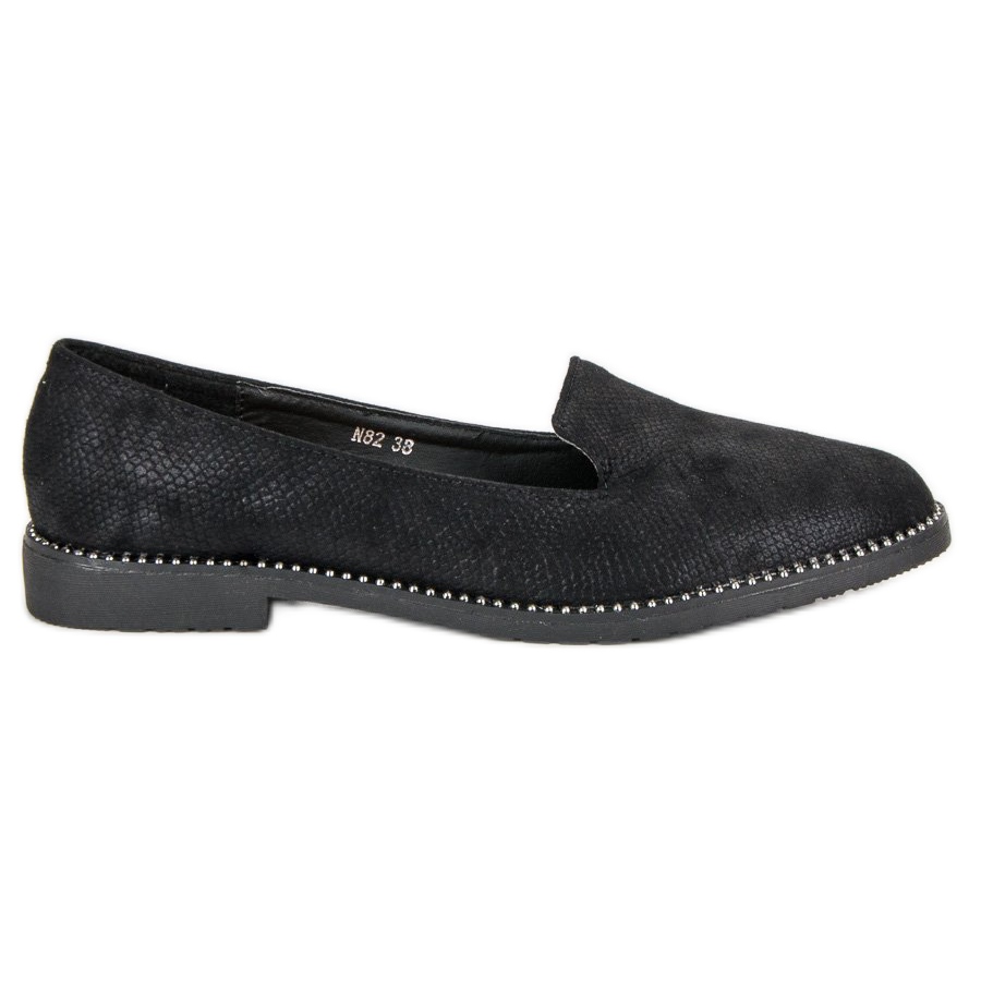 The characteristic round toe and low, rubber sole with a height of 2.0 cm provide comfort during all-day wear, and the soft heel adds even greater comfort. The insole made of ecological leather makes the feet feel fresh and pleasant, and additional decorations in the form of rhinestones and a stylish, black color will certainly attract attention.