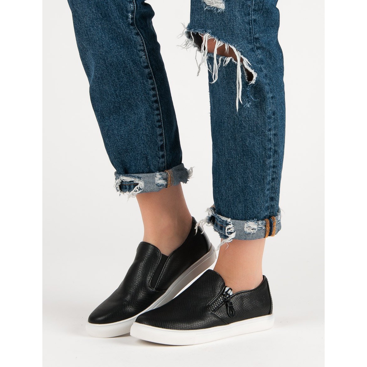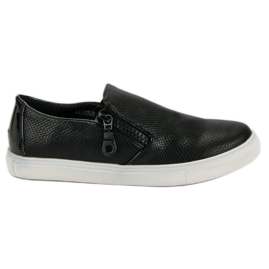 Black slip-ons from Weide are an elegant and stylish proposition for modern women who value comfort and a fashionable look. These slip-ons, without heels, are made of high-quality ecological leather, which makes them an ideal choice for people who care about ecology. An interesting detail is the decorative zipper, which adds originality and character to them.