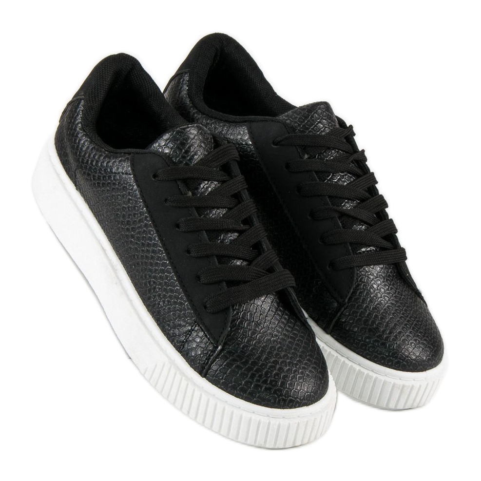 Discover fashionable women's sports sneakers in an elegant black color. Their upper, made of material imitating snakeskin, adds originality and character to every styling. These unique shoes are a great addition to youthful, fashionable outfits, and at the same time they will work great in more elegant combinations.