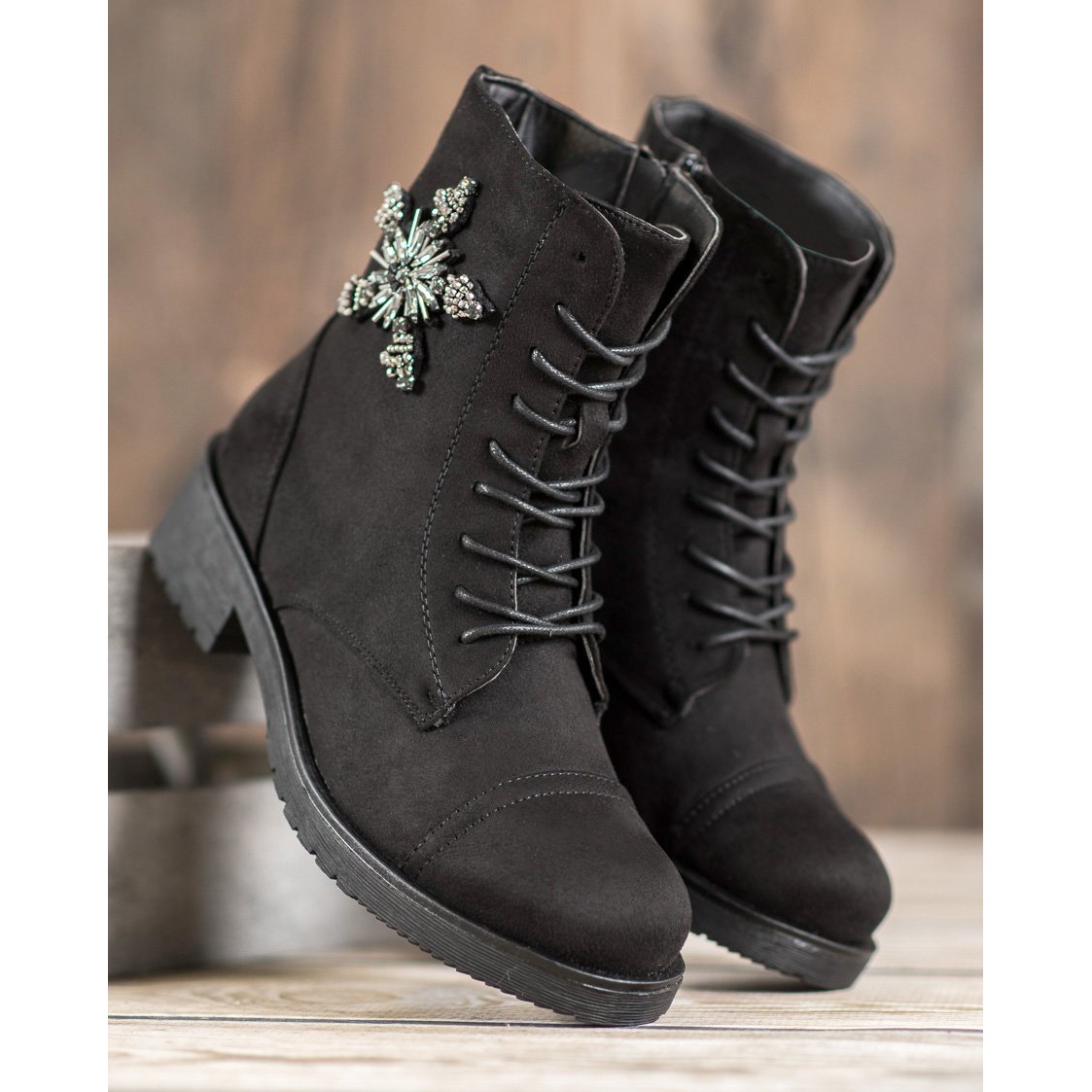 Discover exceptional elegance and style with the black SHELOVET suede ankle boots. Made of high-quality ecological suede, these fashionable women's shoes are a great choice for autumn days. Their lace-up construction and original, sequin decorations attract attention, adding a unique character to each styling.