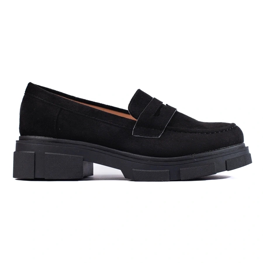 Elegant and comfortable black shoes made of ecological suede. A classic, casual cut of loafers with a full, round nose, built -up and soft fastening and a comfortable insert of ecological leather. Perfect for a daily basis - for work, for a walk and for urban stylizations.