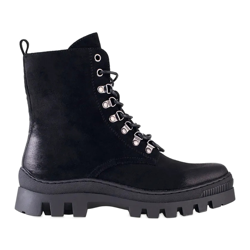 The classic and expressive W. Potocki workers in a black suede finish are the perfect choice for cooler days. The combination of a casual and rock character means that the shoes fit perfectly with everyday stylizations - from jeans and a leather jacket to a dress with thick tights. A solid, retreaded sole and warming guarantee comfort and stability in autumn and winter.