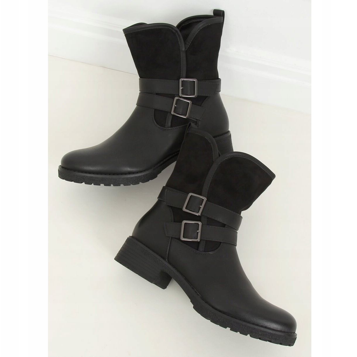 Made of a combination of ecological leather and ecological suede, the ankle boots look exceptionally attractive. The pure black color makes them easy to match with a variety of styles, making them a staple in your wardrobe. The straps with buckles surrounding the upper give them additional character, making the shoes stand out from other flat models.