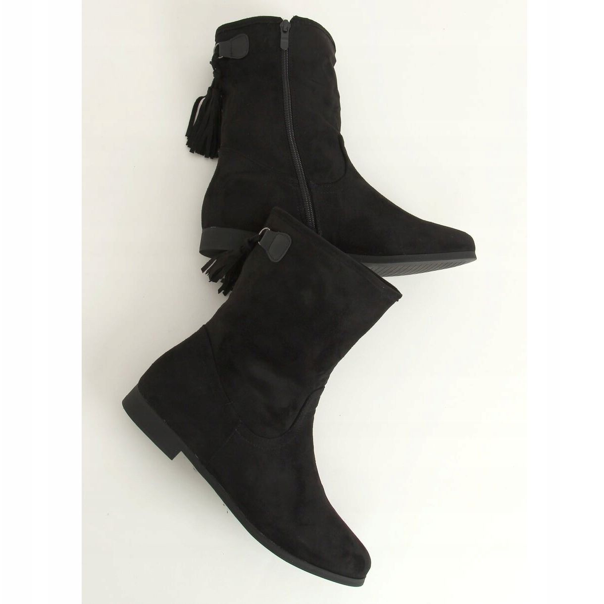 We present women's saszki ankle boots in an elegant black color, model J19-97 Black. These stylish flat shoes combine classic and modern design, creating the perfect choice for any occasion. The simplicity of the design is subtly diversified by fringes on the back, which add a unique character to them.
