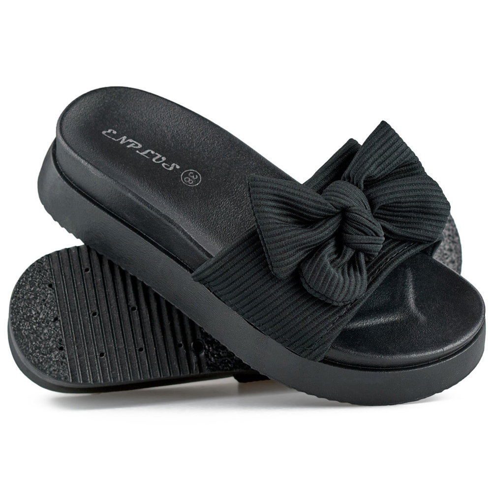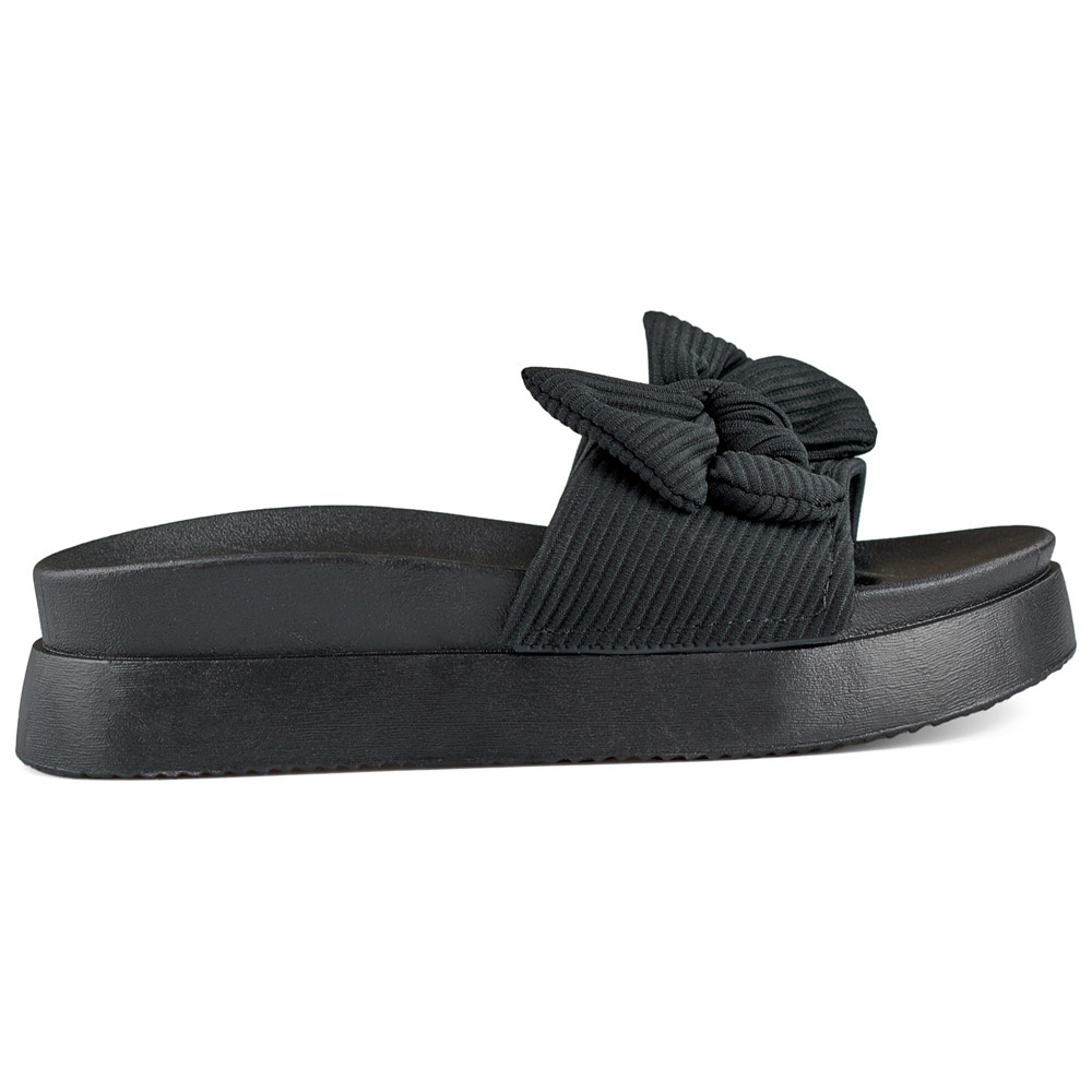 Here are women's slippers with a bow on a thick sole, perfect for everyday outings and relaxing moments on warm days. Made of high-quality textile materials, they provide comfort and lightness in use. The black, elegant finish matches many styles, and the additional accent in the form of a bow adds charm.