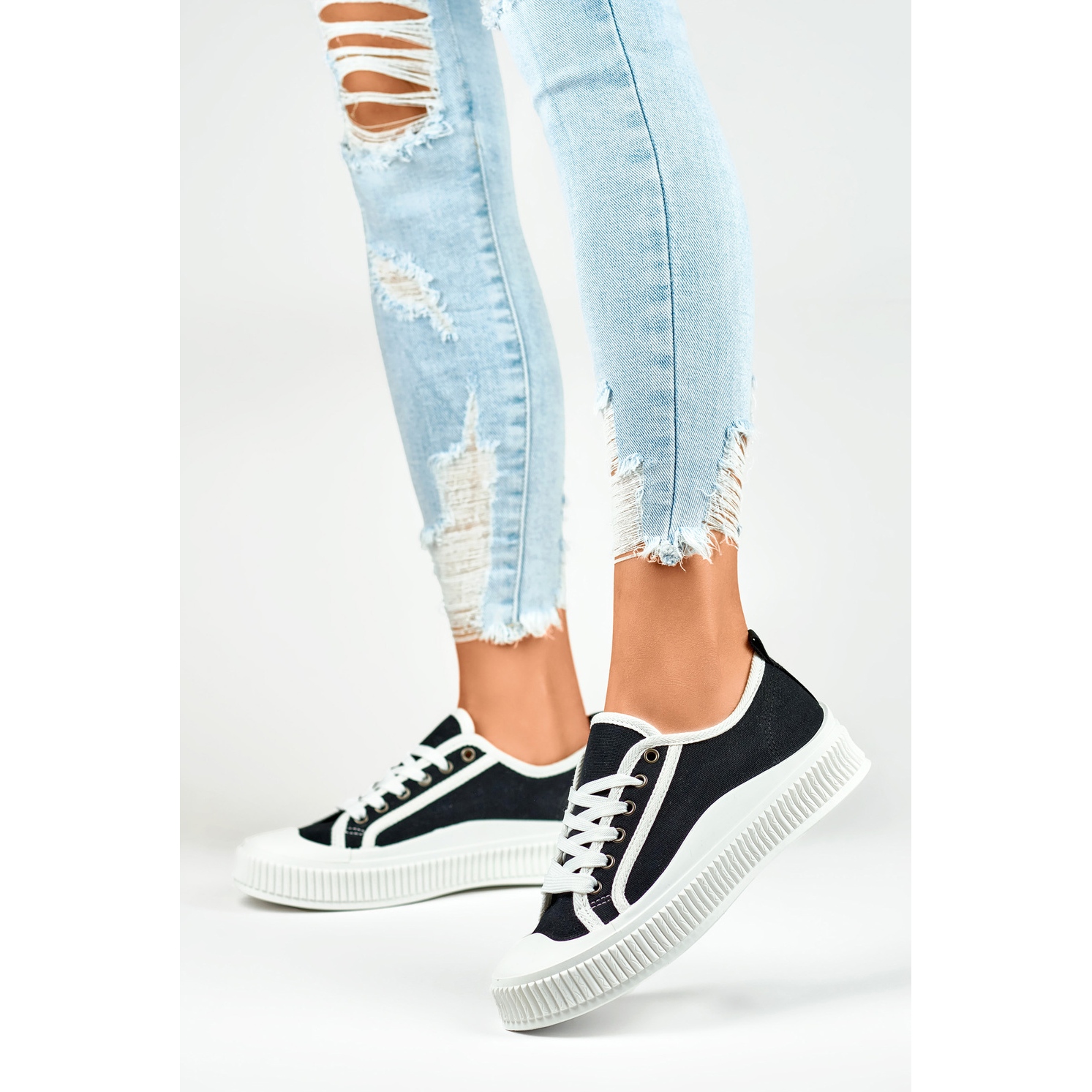 Black women's sneakers with a white sole - a classic and universal model that will work in everyday stylizations. A simple, timeless cut with a round nose and a contrasting white sole adds lightness and sporty character, and the textile upper ensures breathability and comfort of wearing.