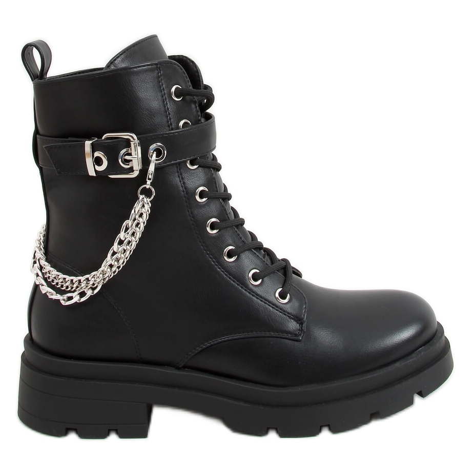 Introducing the Workers with chains in black – the RQ381 Black model, which will certainly become an inseparable element of your wardrobe! These women's lace-up ankle boots stand out with a high sole, which adds character and makes them extremely stylish. The original design with detachable chains is a fashion hit that you cannot miss!