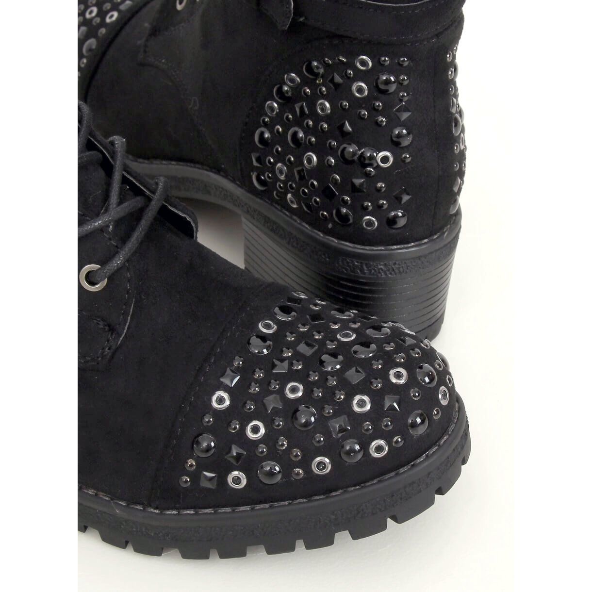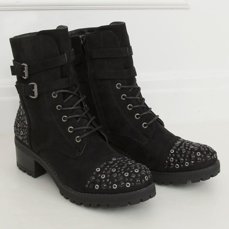 We present black worker boots no. 88063 Black - the perfect choice for women who want to combine classic with a bit of rock madness. These lace-up boots on a sole with a protector stand out with spectacular decorations that attract attention. Shiny stones and rhinestones add a unique character to them, thanks to which every owner will feel like a real star.