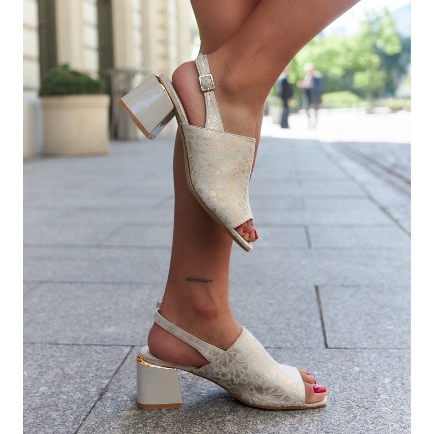 Sandals on a block with a NUNA leather insert in a beige shade are a great choice for summer days, combining comfort and fashionable design. Their classic form in a high, stable heel with a height of 5.5 cm makes them not only comfortable, but also promise elegance in every stylization. Made of ecological suede leather, these sandals not only look beautiful, but also take care of the environment. The leather insert provides high wearing comfort, and the buckle allows you to easily fit to the foot.