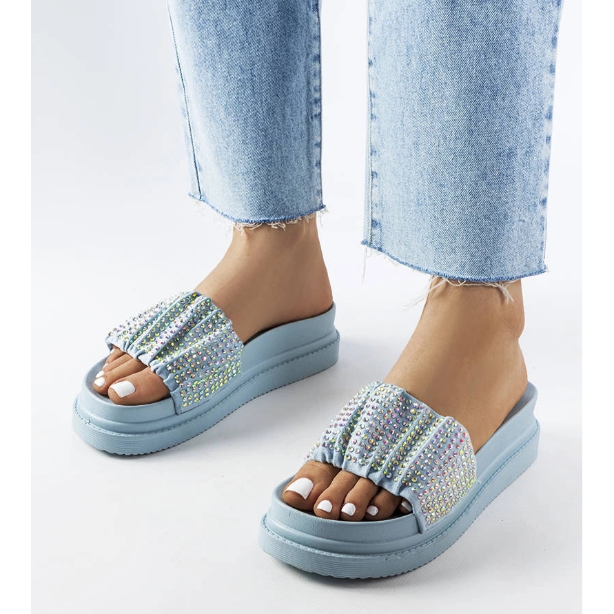 Blue flip flops with Franet zircons - style and comfort for the summer. The elegant, modern cut in an intense blue shade with a shiny zircon on the upper part makes these slip -up flip flops work well for both everyday and evening stylizations. The lightweight, airy design provides comfort on hot days, and a stable, high heel 5 cm high gives a feminine look while maintaining the comfort of walking.