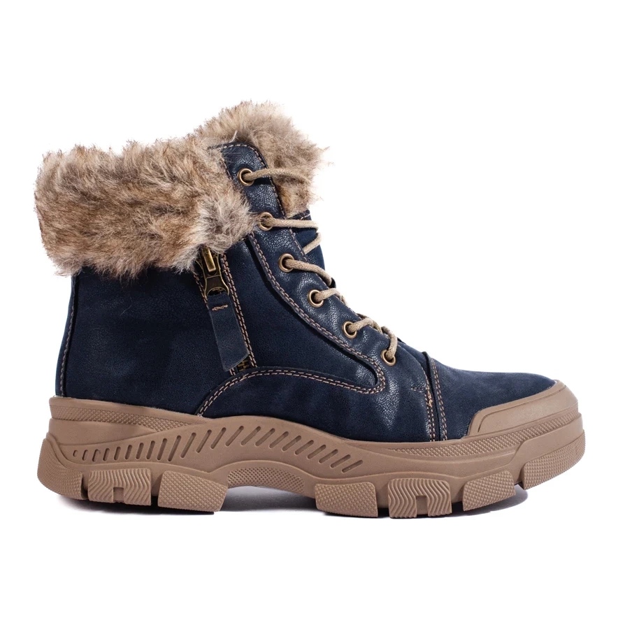 Blue women's trappers with fur - warm, comfortable and stylish shoes for cooler days. Perfect for everyday, casual and sports stylizations in autumn and winter. The combination of ecological leather, a soft sheepskin coat and a solid sole ensures comfort, insulation and good grip.