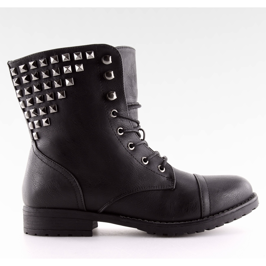 S170 black worker boots - rock character in a feminine version. Lace-up ankle boots in classic black with strong details: decorative studs on the back of the upper and a massive sole with a protector give them a predatory and at the same time universal style. Thanks to the black color, you can easily match them to everyday and evening styles, and the delicate fur inside provides additional comfort and warmth on colder days.