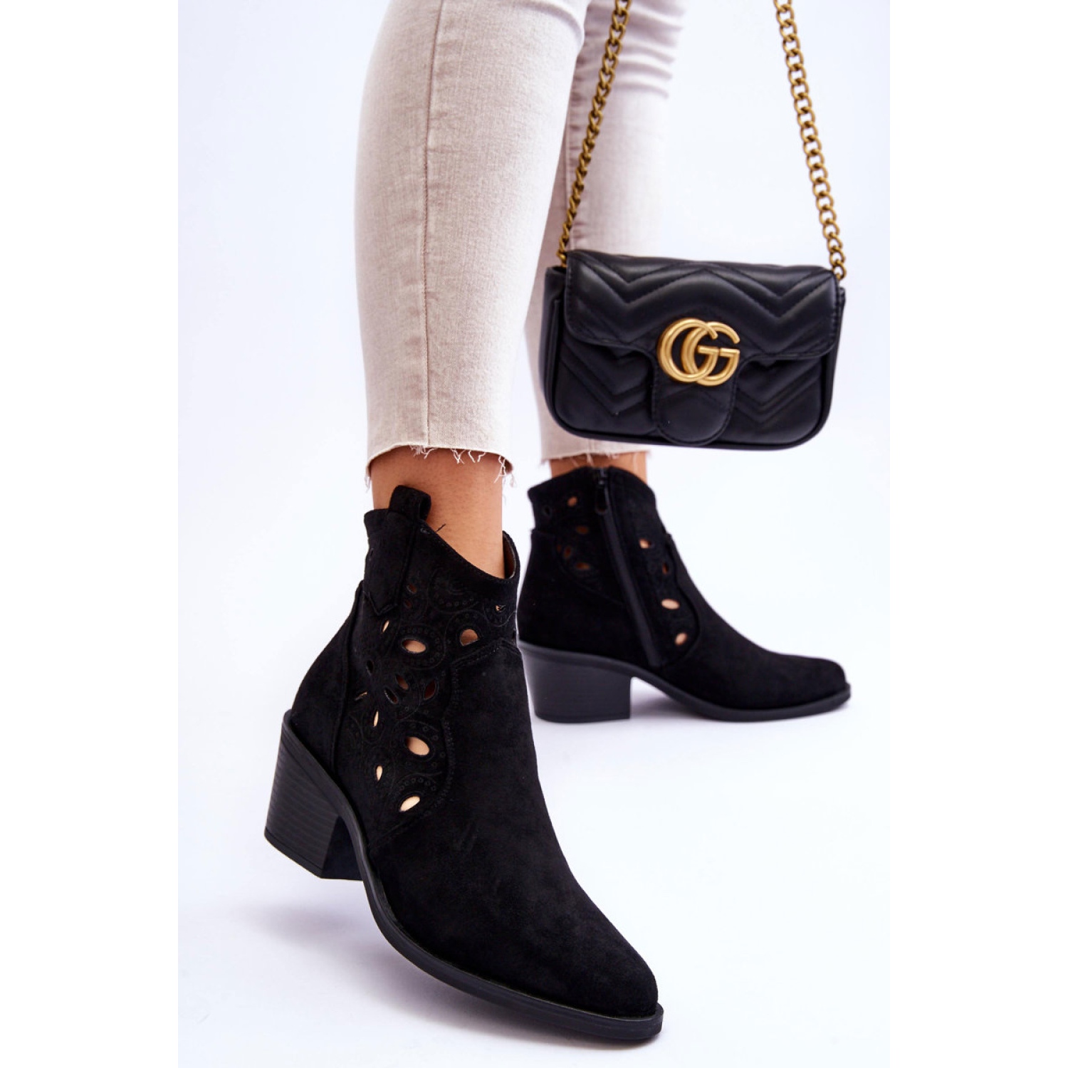 Fastened by the side of the upper for a zipper, the boots are easy to put on, and the stiffened heel gives them character and support for the foot. Made of high -quality eco suede into an attractive, openwork pattern, perfectly fit into fashion trends, and their universal black color makes them match many styles.