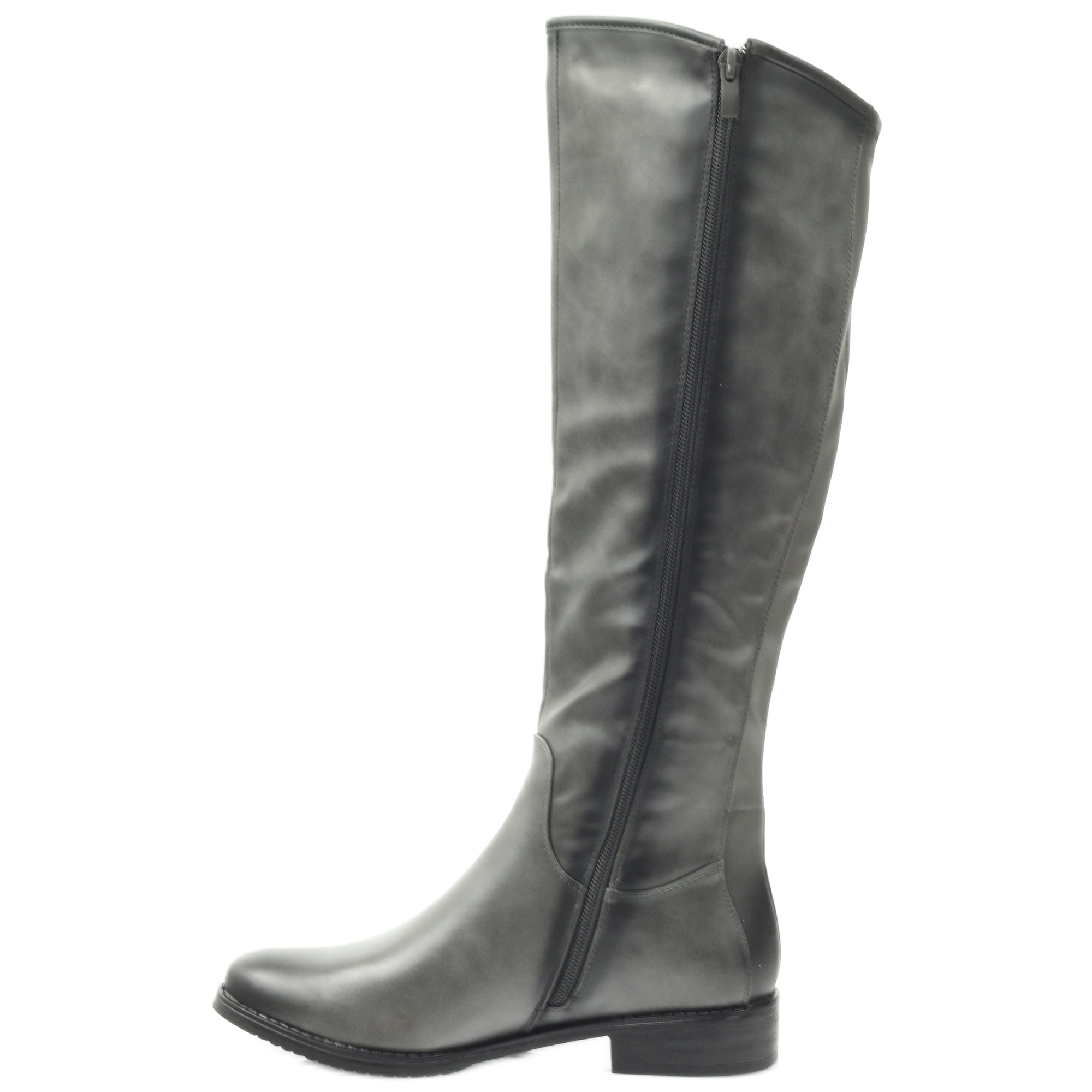 The boots have a shaft length of about 45 cm, which means they reach the knees, and their circumference is about 38 cm. This style not only shapes the figure beautifully, but also fits perfectly with both everyday and more elegant styles. They are characterized by a flat heel of 3 cm and a round toe, which guarantees comfort of wearing all day long.