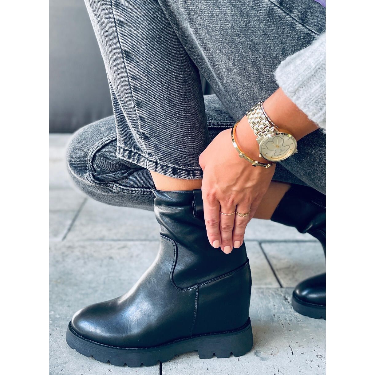 If you are looking for footwear that combines high wearing comfort with current trends, it is worth taking a look at the Luanda Black black ankle boots with a hidden wedge. These elegant, full-grain women's ankle boots have been designed to complement a variety of everyday styles, while maintaining their uniqueness and class.